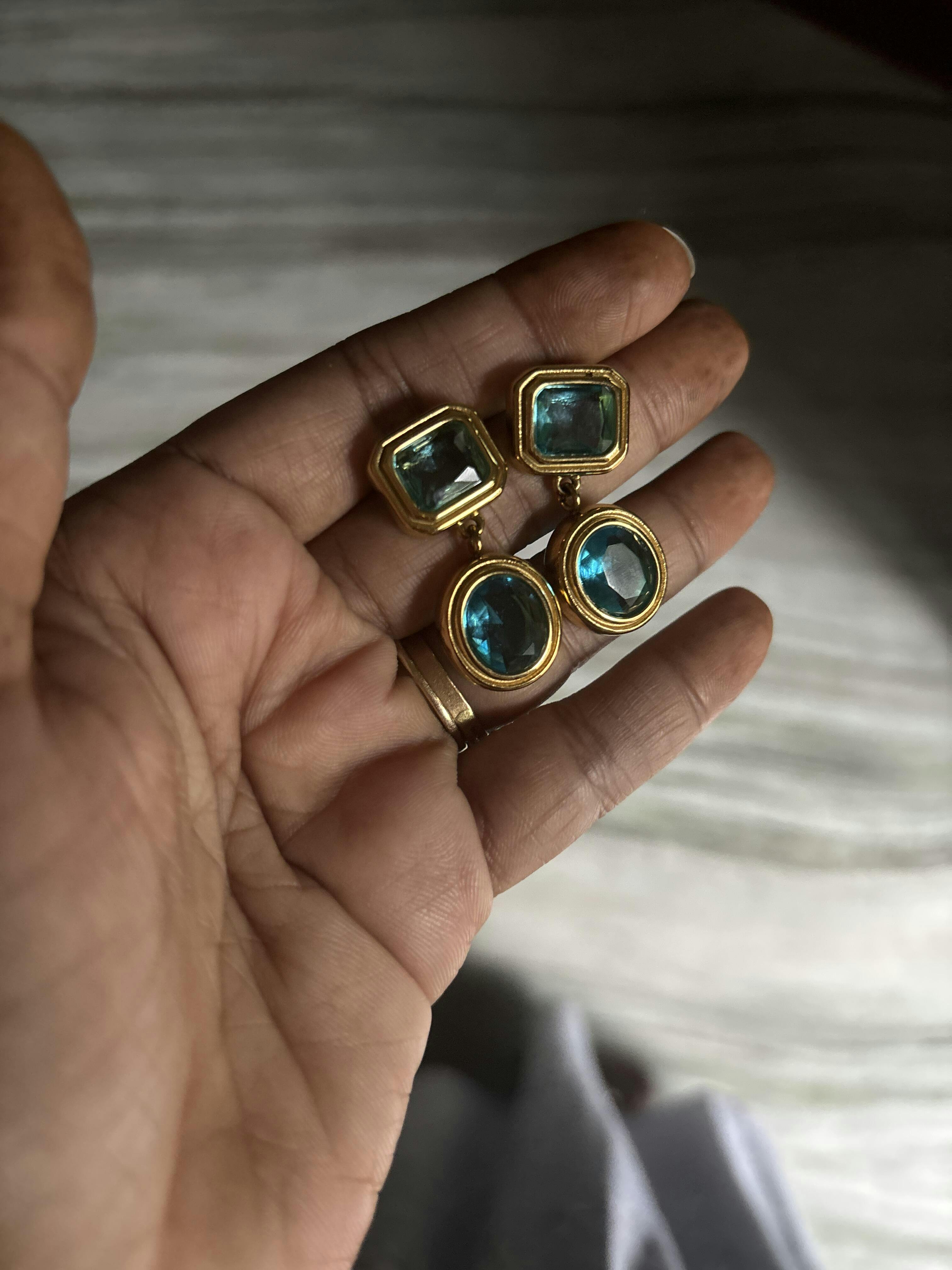 These stunning earrings feature two drops of sparkling blue cubic zirconia stones, suspended from a gold-plated setting. The contrasting shapes and sizes of the stones create a mesmerizing look that is both elegant and playful.